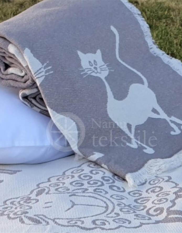 Jacquard weave rugs are made of 100% cotton with a fun kitten pattern. The natural fiber rug is used instead of a blanket on hot summer nights, it does not need to be wrapped. Cotton absorbs moisture well, is gentle on the body and does not cause allergies. This rug is a great choice for a picnic or a lazy rest on the beach.