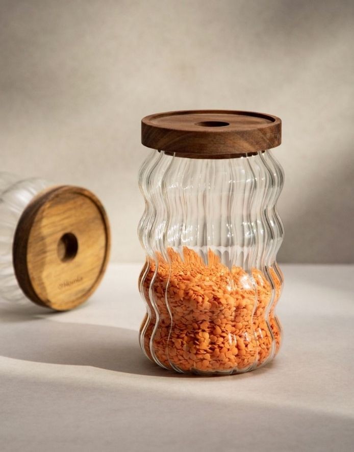 VALOVIT glass container is a stylish and practical solution for storing your favorite foods. The ribbed surface gives it a unique look, and the natural acacia wood lid adds warmth and elegance.