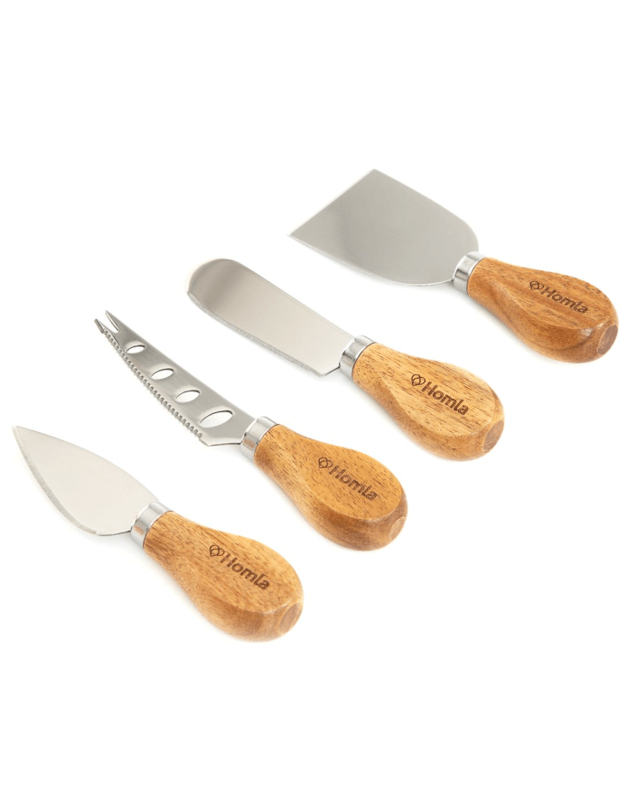 This set consists of four knives with a special stand. Each of the knives has a different shape so that you can choose the one that is ideal for different types of cheese. The stand features a tasteful design related to this delicacy. All the elements of the set are covered with beautifully coloured wood, and the blades have a shiny silver finish.