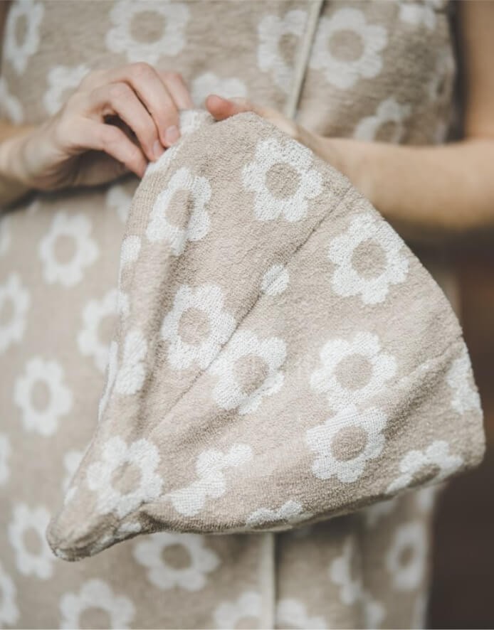 Very comfortable sauna cap, hygienic and light. Easy care and easy to wash. Before putting this hat on your head in the sauna, it can be moistened in water to further protect your head and hair from the effects of dry, hot sauna air.