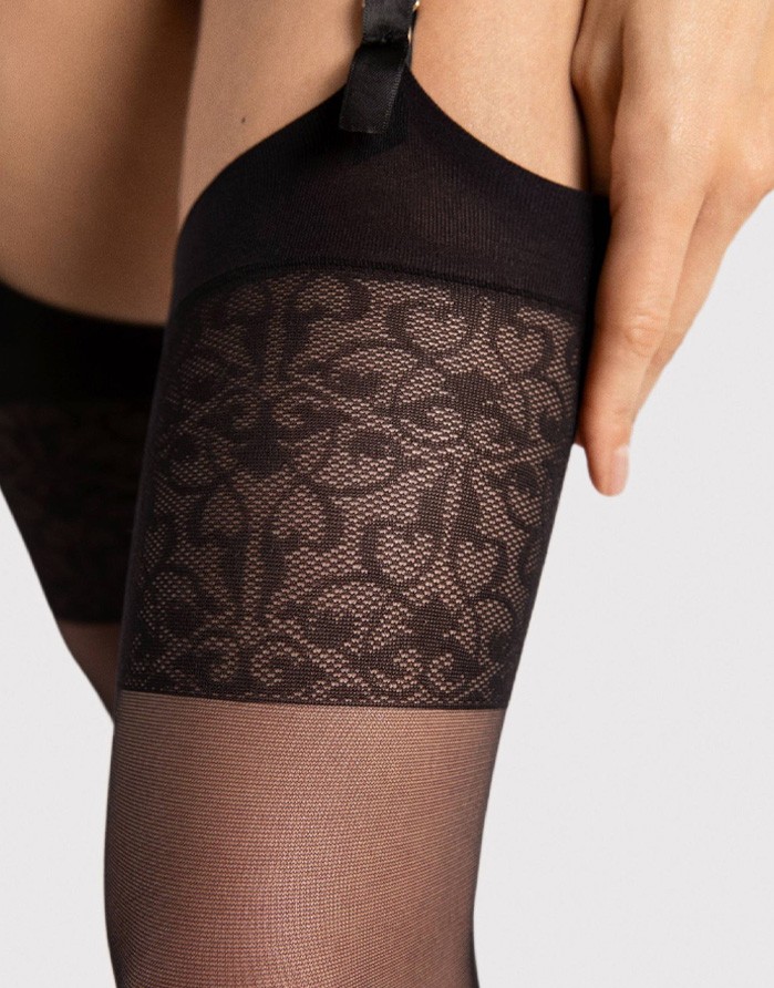 Seksikad klambriga sukad "Vesper" õmblusega. Sukkade ülaosa on kaunistatud muljetavaldava pitsiga. Seljal on vertikaalsed jooned, mis ulatuvad kogu pikkuses.