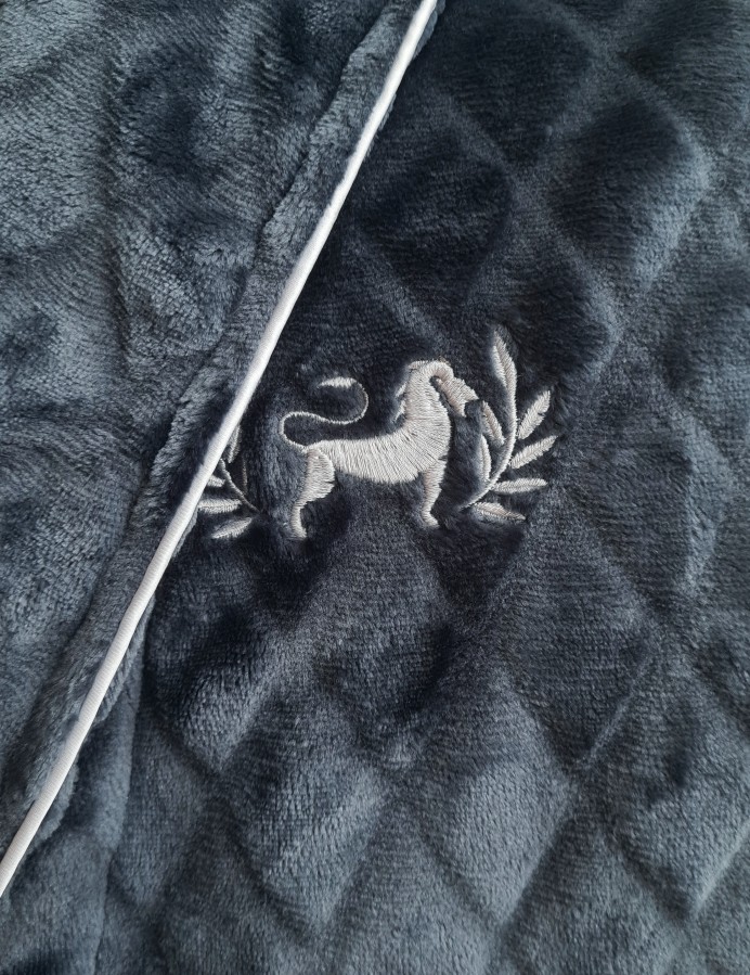 Pehmest, tekstuursest kangast hommikumantel tikandiga rinnal.