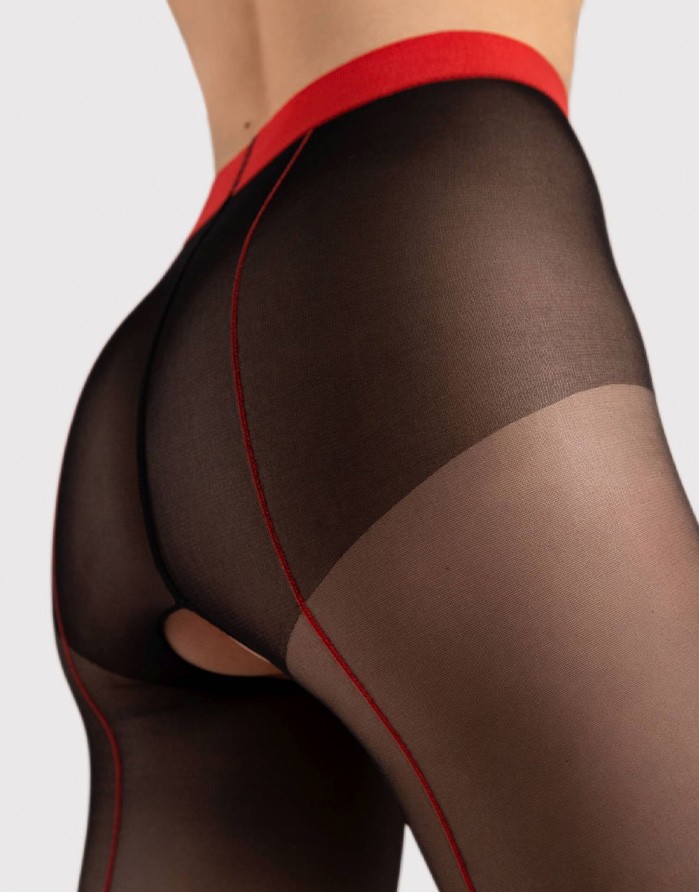 "Fiore" brändi kõrgkvaliteetsed, sensuaalsed disainist retuusid, kaunistatud punase lõngaga tagant, avatud intiimne ala. Matt viimistlus, kõrge, mugav vöökoht, peenetundlikult tugevdatud varbaosa.