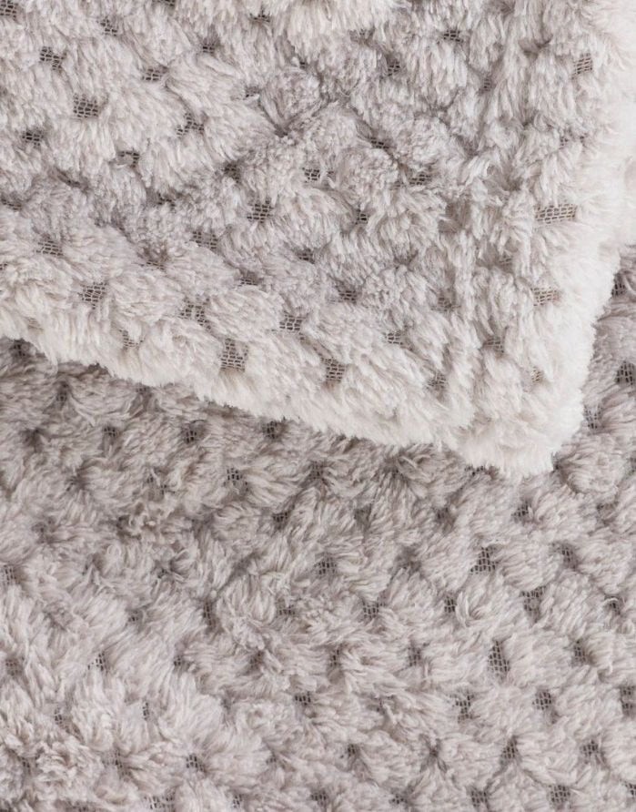 Всё покрывало светло-серого цвета с нежным декоративным принтом. Края аккуратно обработаны, что свидетельствует о высоком уровне мастерства.