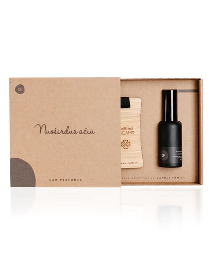 Komplektist leiad aroomikaardi ja sama lõhnaga sprei, millega saad aroomikaarti sisse hingata või kasutada värskendajana auto salongis või siseruumides.