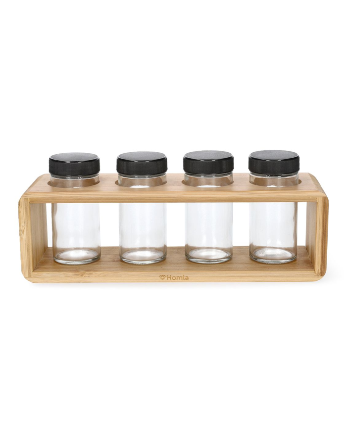 Komplektis on 4 väikest purgi koos sõelaga, mida saate täita oma lemmikvürtsidega. Neil on suletud plastkaaned, mis kaitsevad vürtse niiskuse eest. Purgid seisavad naturaalset värvi puidust alusel.