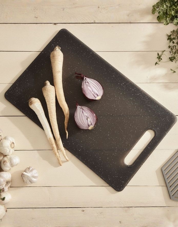VASTO lõikelaud on aksessuaar, mis ühendab funktsionaalsuse ja esteetika. See on valmistatud tumehallist värvist, selle pinnal on väikesed valged täpid.