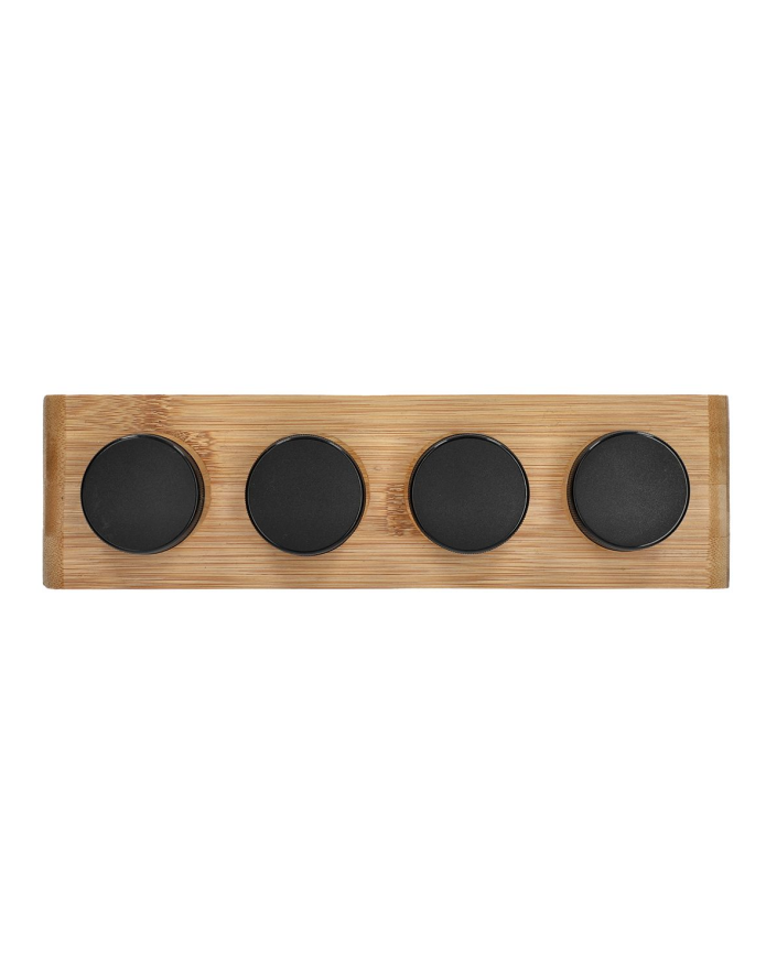 Набор состоит из 4 маленьких баночек с ситечками, которые вы можете наполнить своими любимыми специями. Они имеют герметичные пластиковые крышки для защиты специй от влаги. Баночки стоят на подставке из натурального дерева.