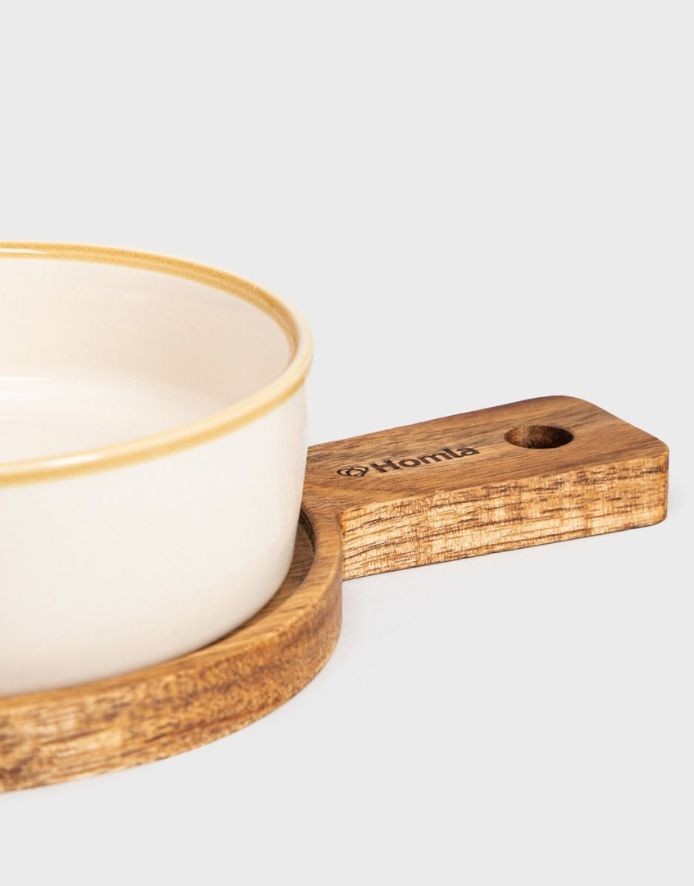 - Миски изготовлены из высококачественной керамики кремового цвета, а основание – из прочной древесины, которая легко моется и безопасна для пищевых продуктов.