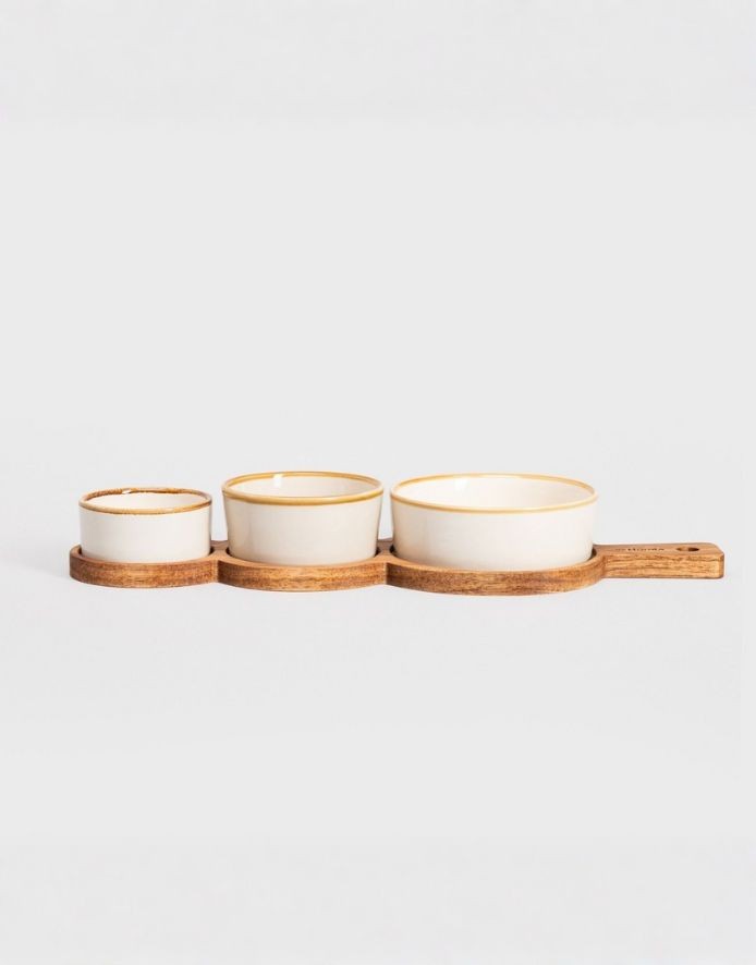 - Состоит из трёх керамических мисок разного объёма, установленных на удлинённом деревянном подносе.