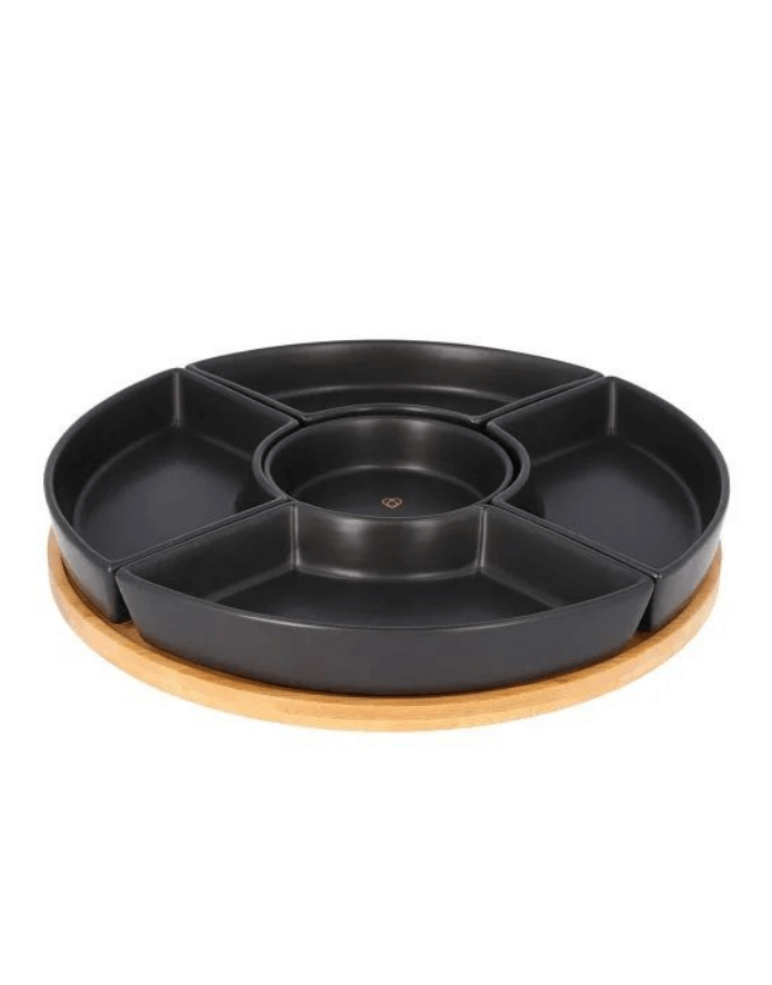 Тарелка FINCAN с черными чашами - это идеальный продукт для вечеринок и семейных торжеств - она идеально подходит для подачи закусок и разносолов. Она сочетает в себе функциональность и минималистский дизайн. Основанная на классическом черном цвете и натуральных тонах бамбукового дерева, композиция подойдет как для современных аранжировок, так и для простого декора стола.