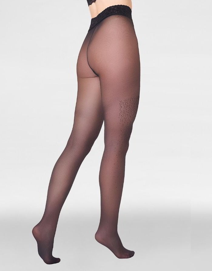Эксклюзивные блестящие колготки, украшенные минимальным количеством циркониевых камней. Пояс украшен широкой силиконовой шнуровкой.