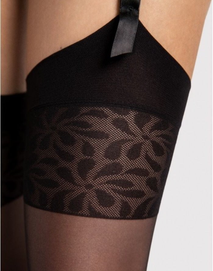 Seksualios, prisegamos moteriškos kojinės. Dekoruotos plačia rašuota juosta.
