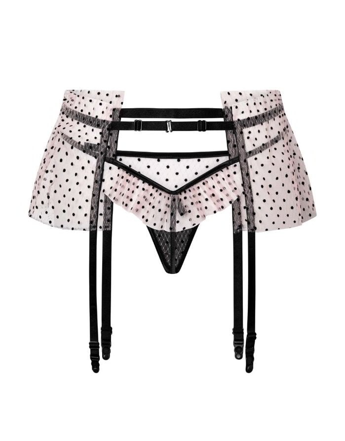 Романтический пояс с трусиками-стринги. Изготовлен из розового тюля в горошек с чёрными регулируемыми бретельками.