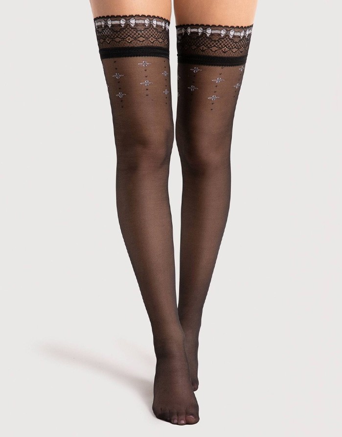 Сексуальные чулки от бренда "Fiore". Кружевная лента с силиконом внутри, которая предотвращает спадение носков. Слегка усиленный носок.
